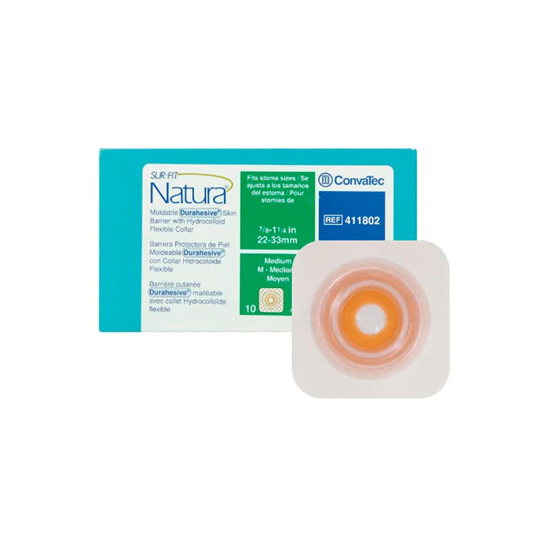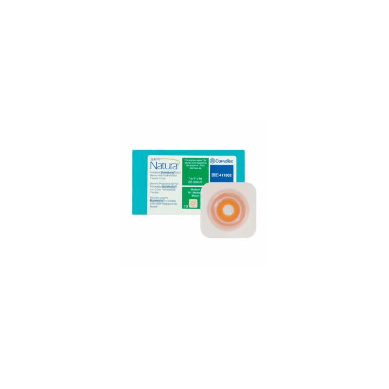 Barrera cutánea plana con un disco de hidrocoloide adhesivo enmarcado con una cinta adhesiva cuadrada. El disco de hidrocoloide es un adhesivo trilaminado. La superficie adhesiva de contacto con la piel está protegida con una placa de silicón. El adhesivo trilaminado tiene Durahesive™ del lado de donde se moldea la barrera cutánea. La barrera se ajusta al tamaño y forma del estoma sin tijeras.